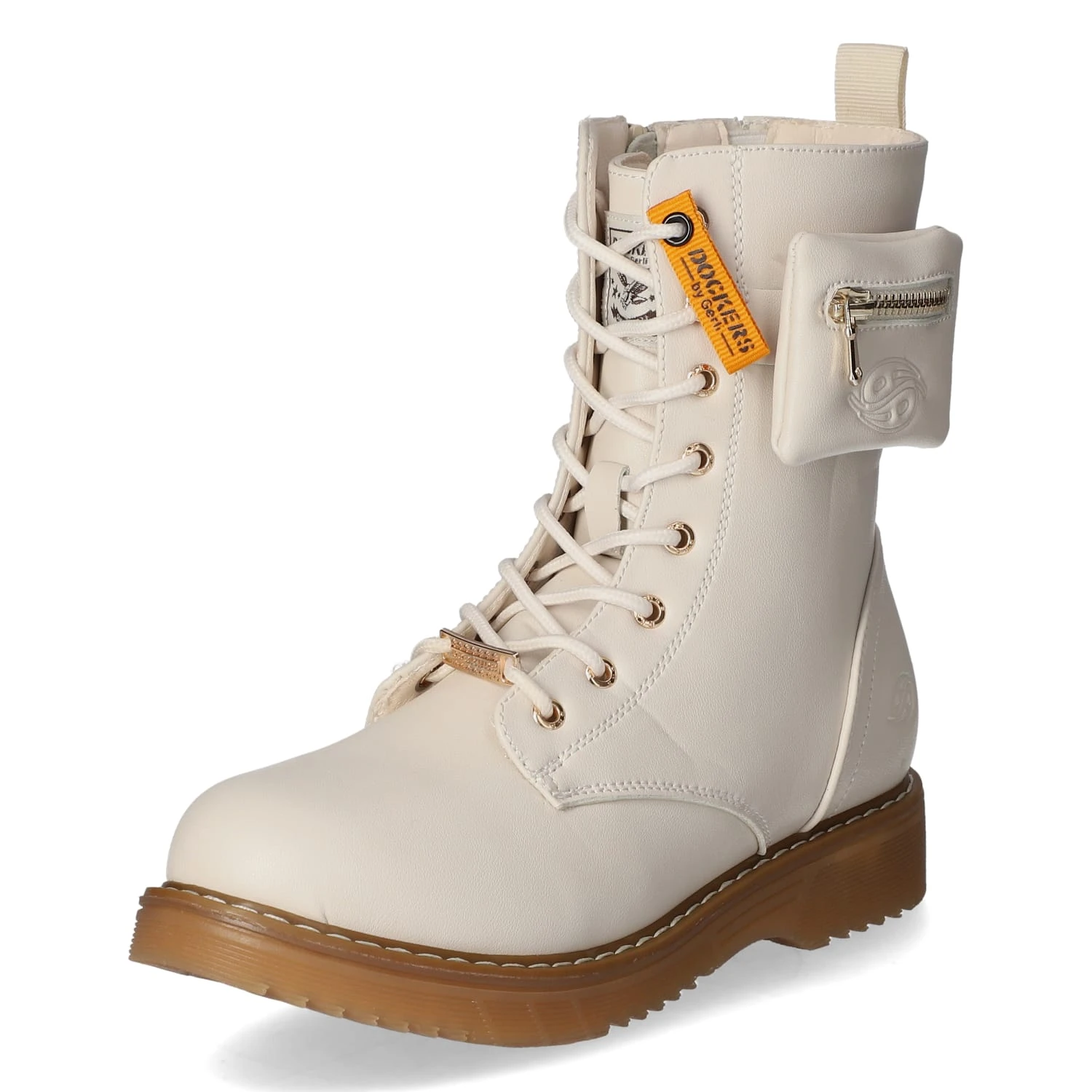Dockers Kinder Stiefeletten/ Schnürstiefeletten Beige Kunstleder – Reißverschluss und Schnürung – Ziernähte – elastischer Einsatz am Schaft – leichtes Futter für kühle Tage – leicht gepolsterte Decksohle – flexible, rutschhemmende Laufsohle – Anziehlasche – kleine Tasche mit Reißverschluss am Schaft – goldig schimmernde Details – Sohlenrahmen in braun