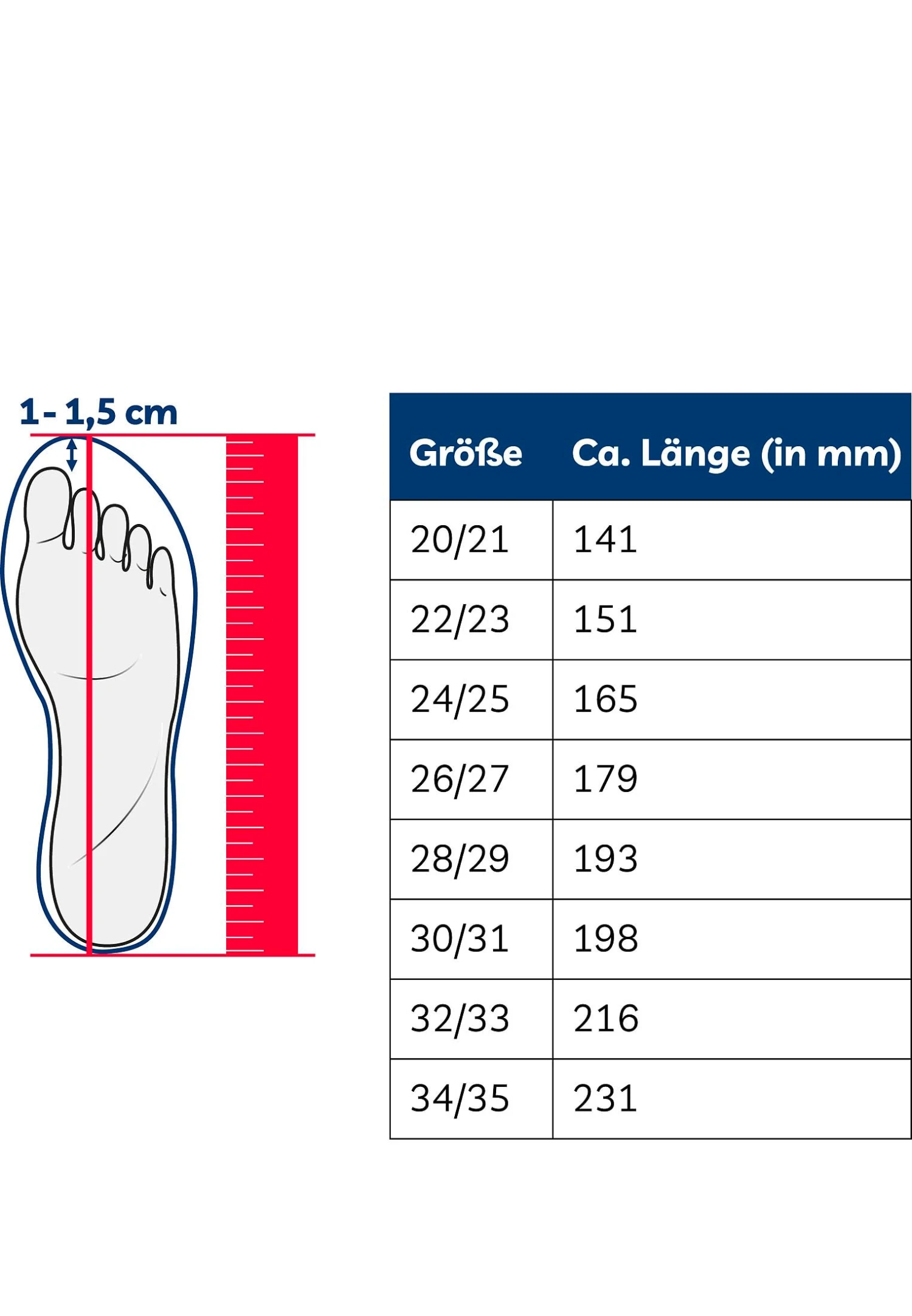 | Größe auswählen | 20/21, 22/23, 24/25, 26/27, 28/29, 30/31, 32/33, 34/35 |